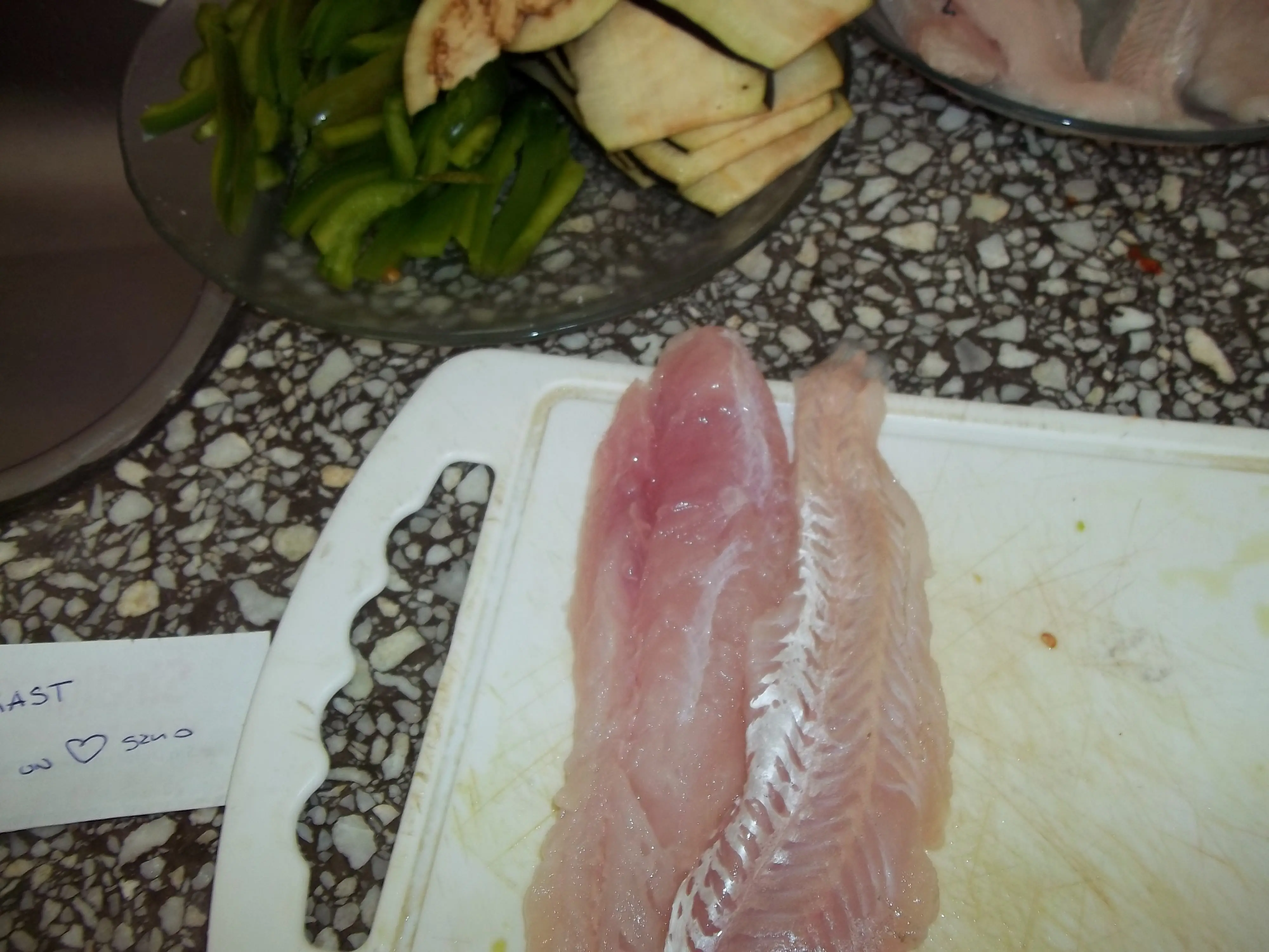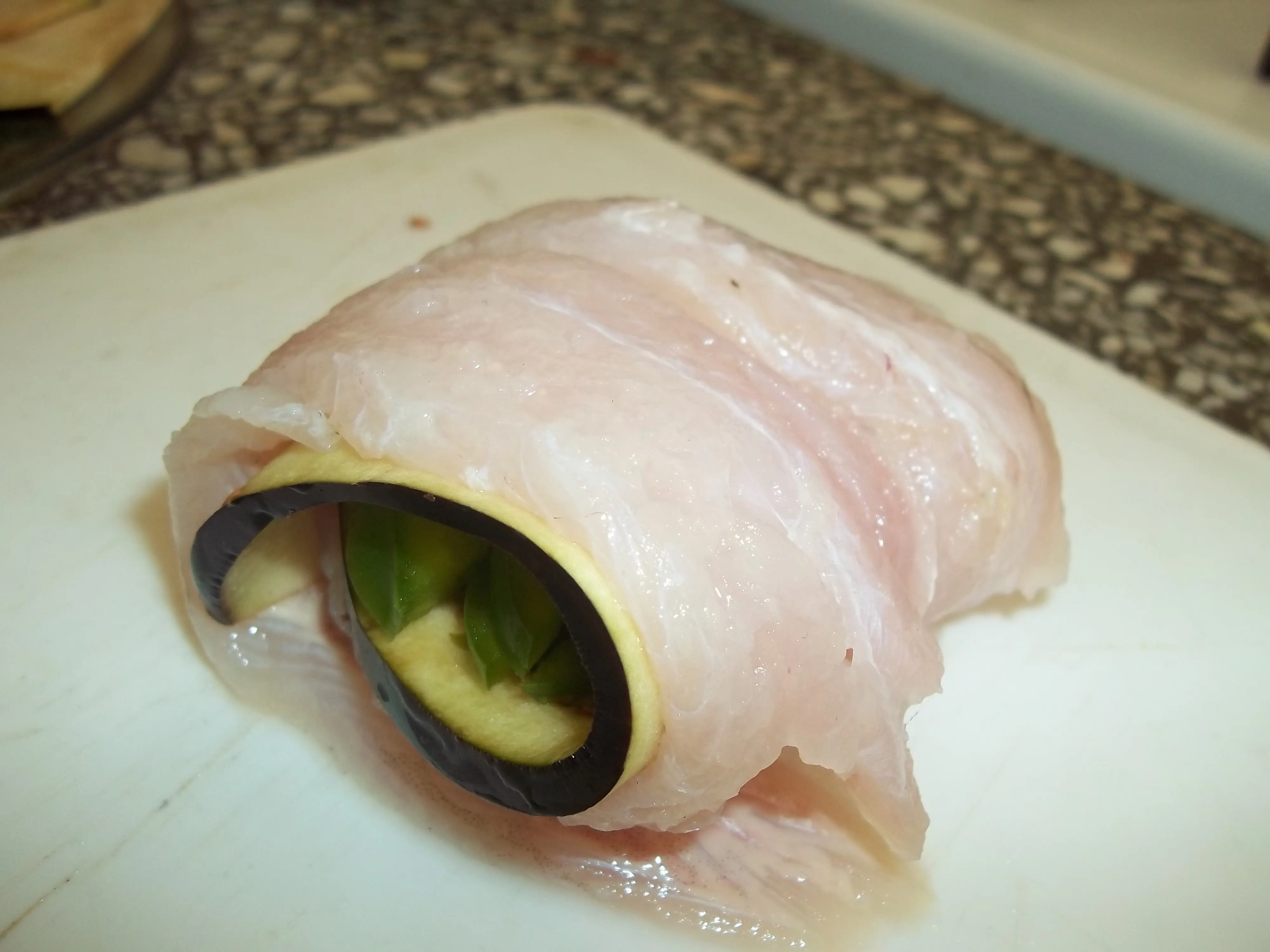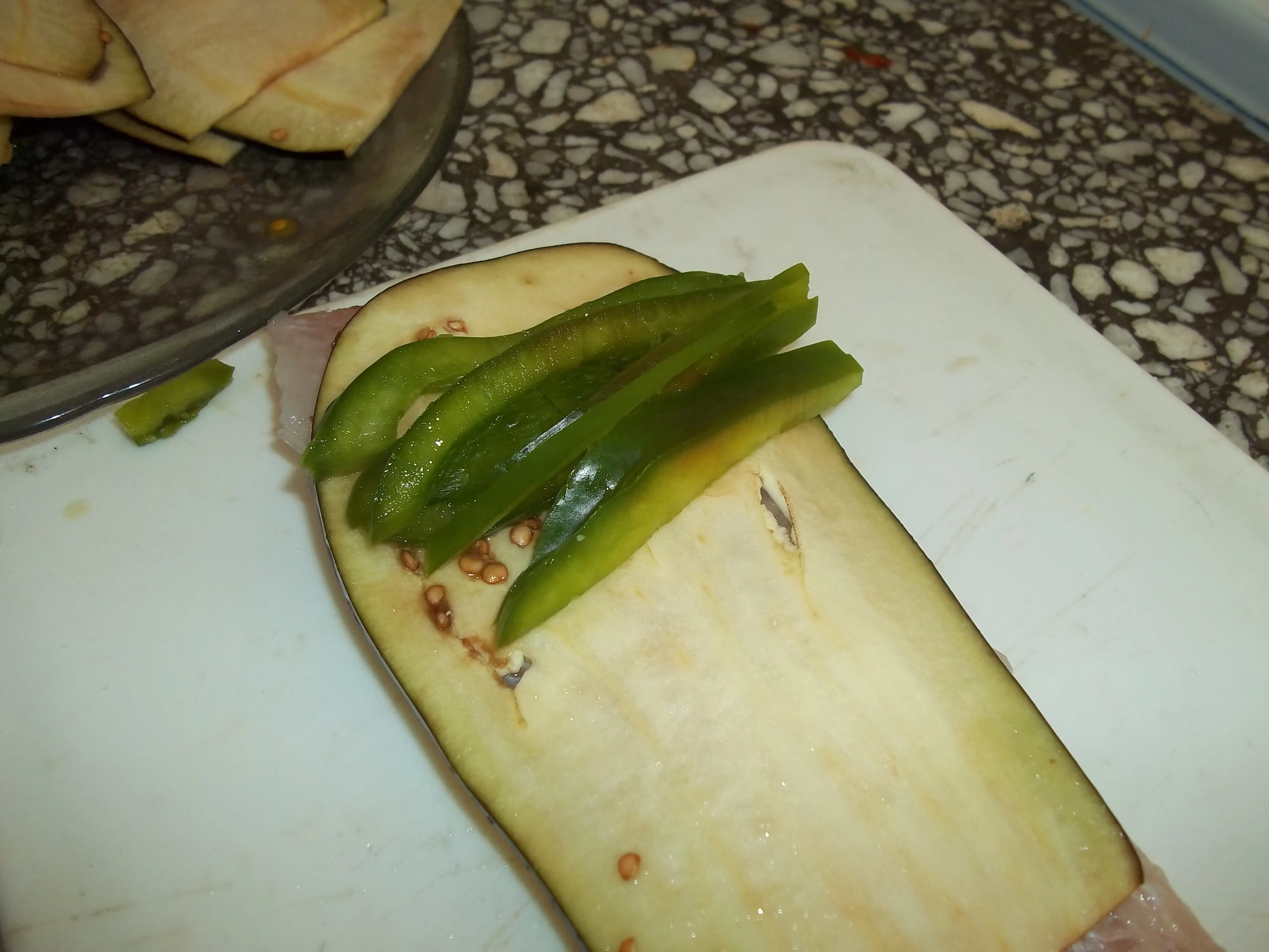 En otra tabla diferente, para evitar la contaminación directa entre alimentos crudos y los vegetales disponemos a lo largo los filetes de pescado, salamos mínimamente, colocamos la berenjena y luego el pimiento en juliana y arrollamos. Luego los disponemos sobre la placa con los otros ingredientes.