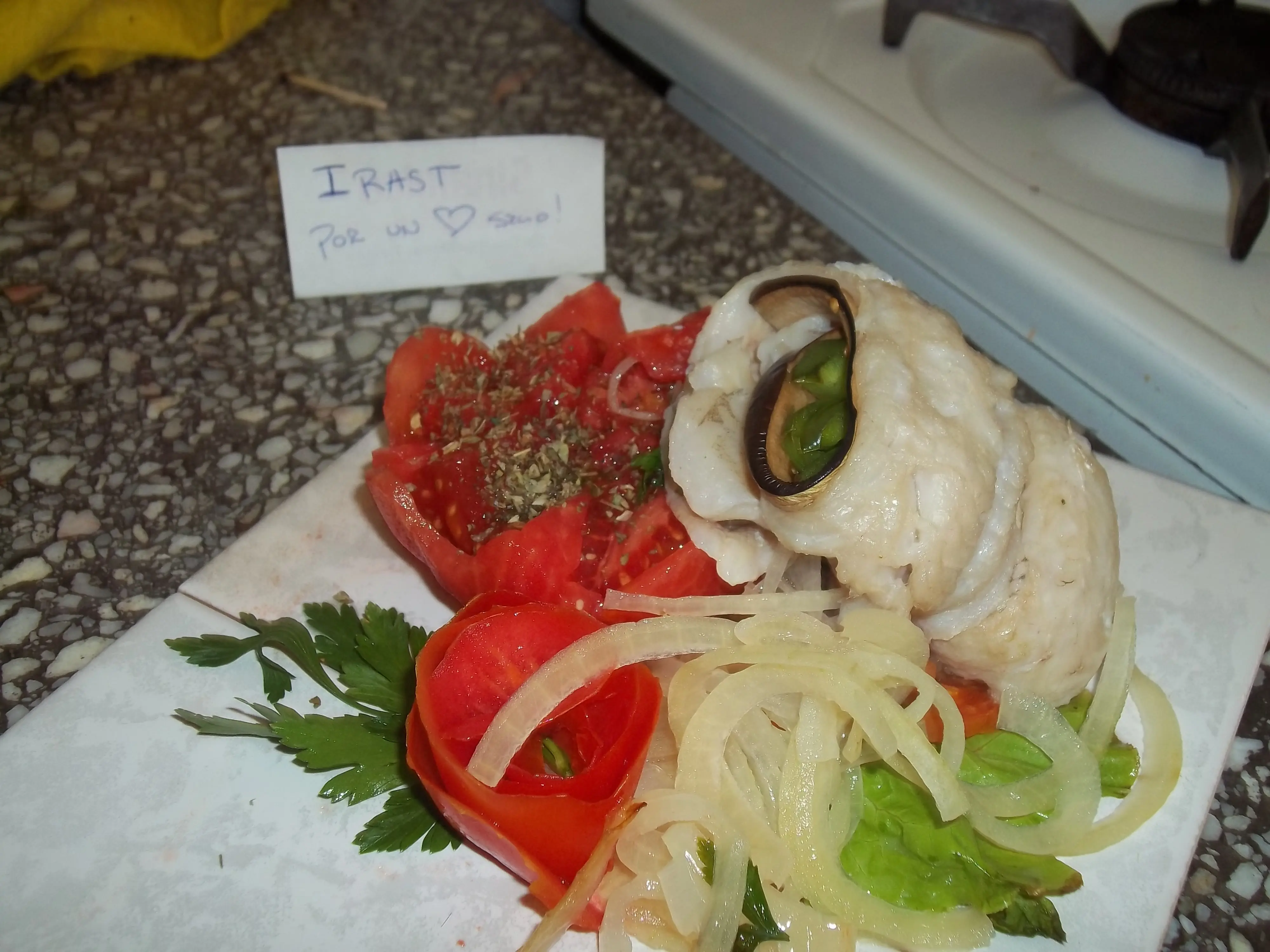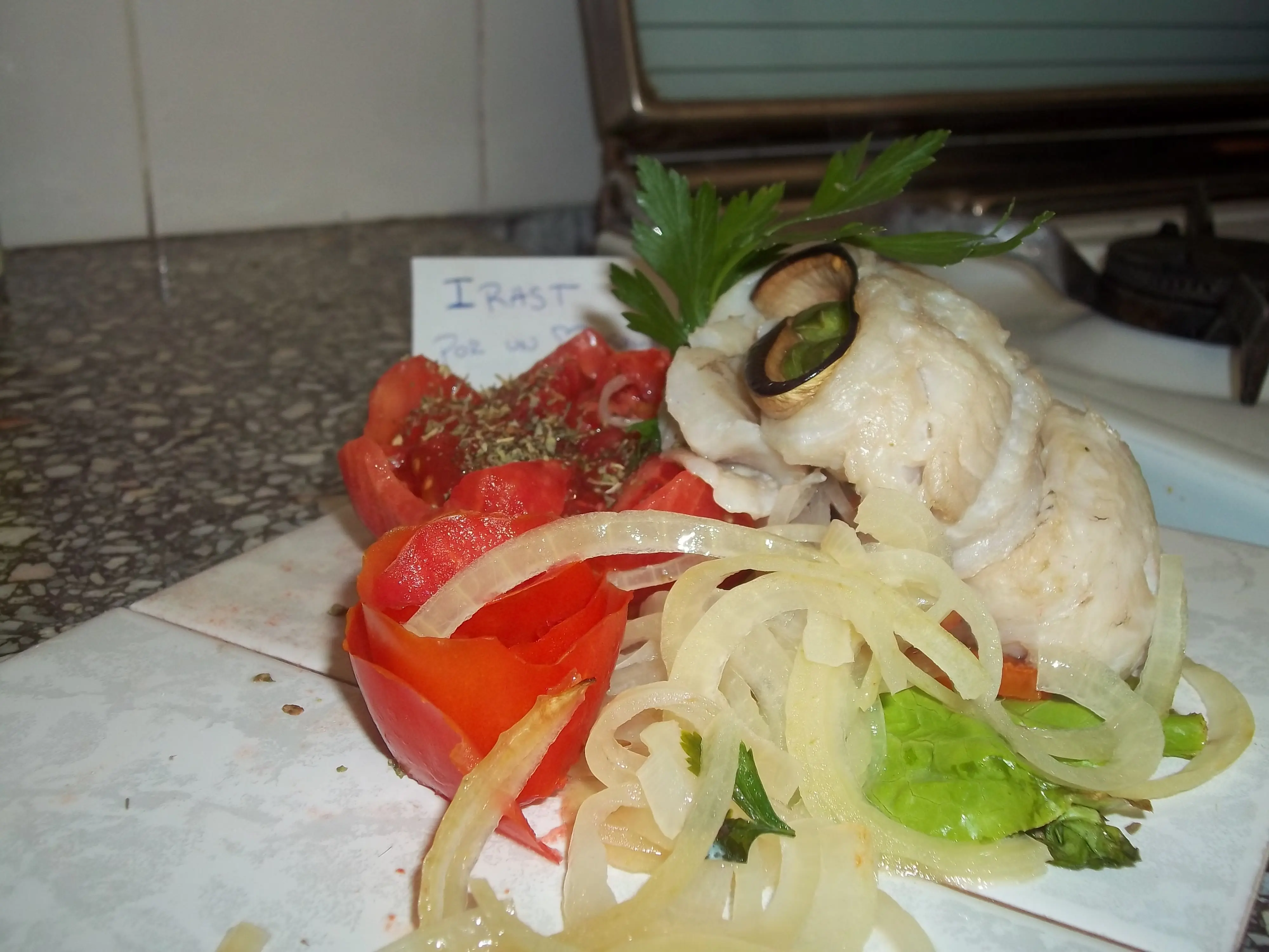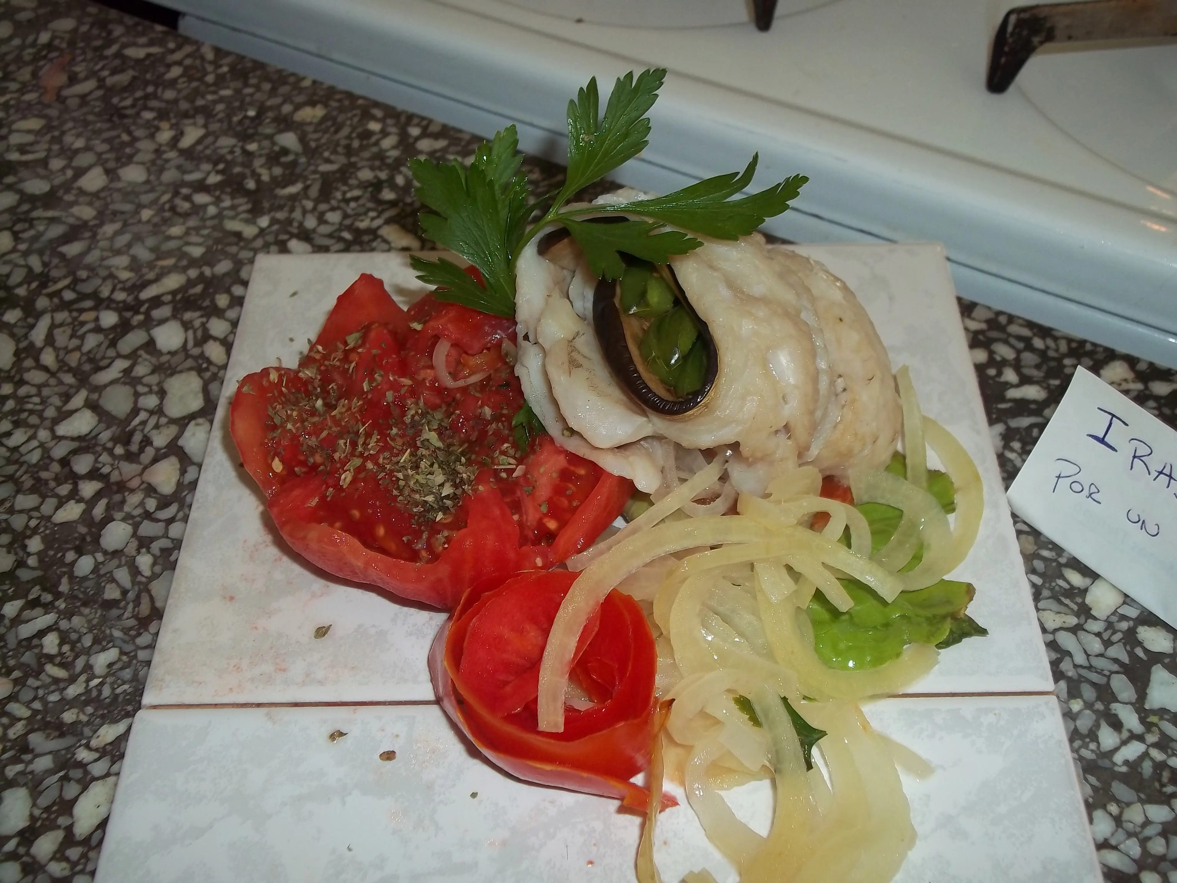 Luego disponemos sobre ellas las rodajas de tomate y un poco de perejil. Nótese que no agrego sal en este momento porque lo que quiero lograr es que esto sirva para saborizar el pescado con su aroma.