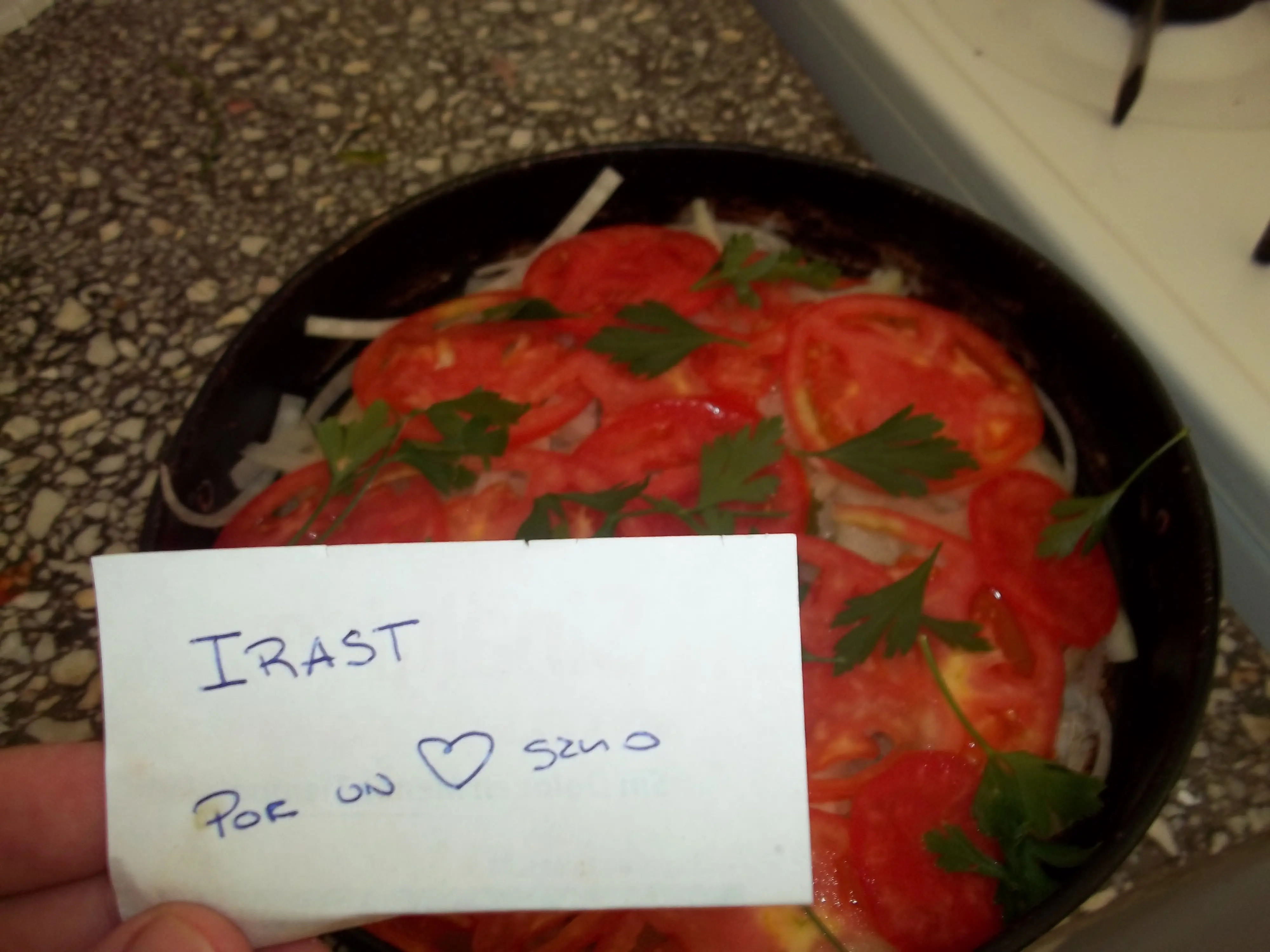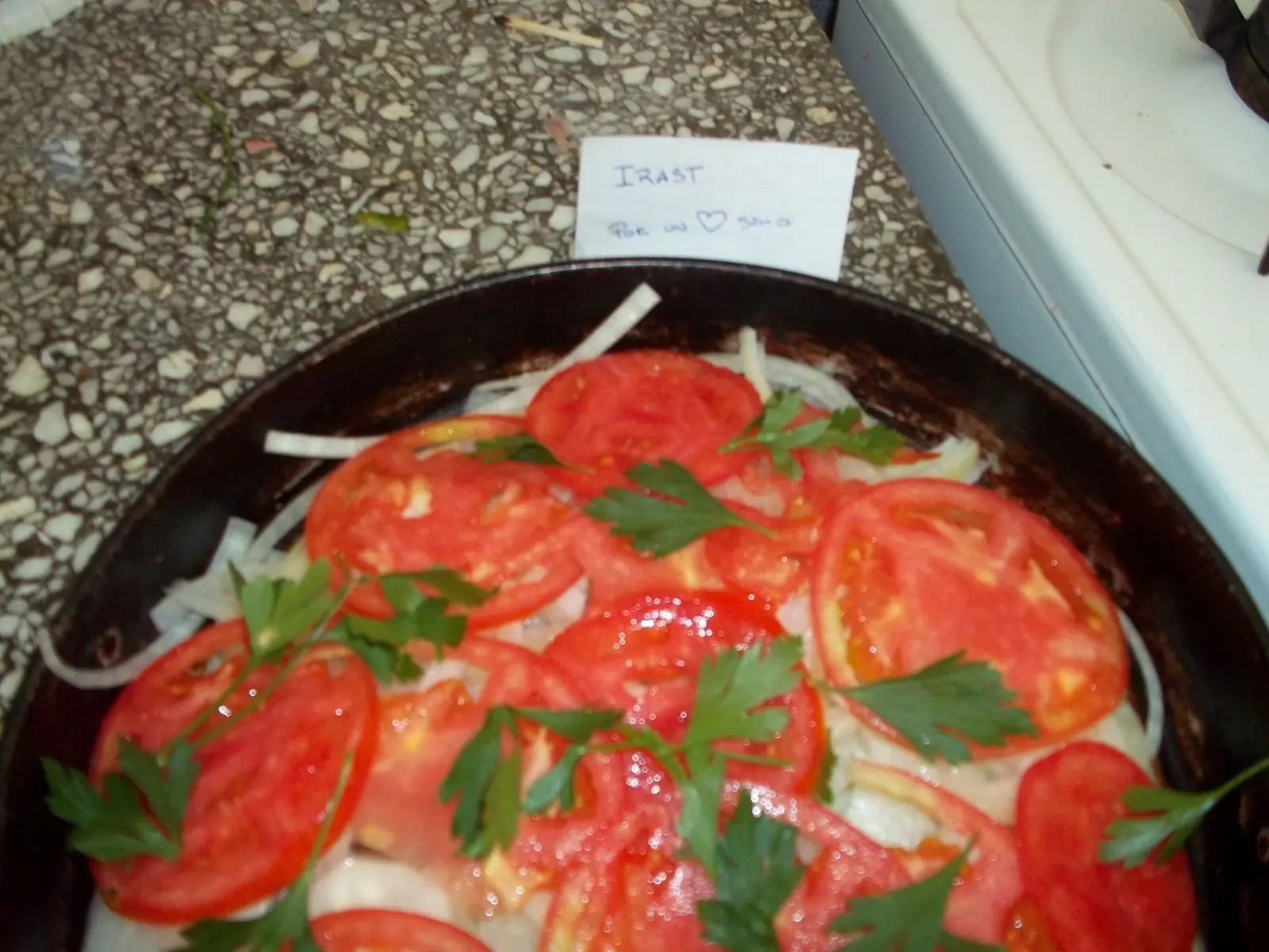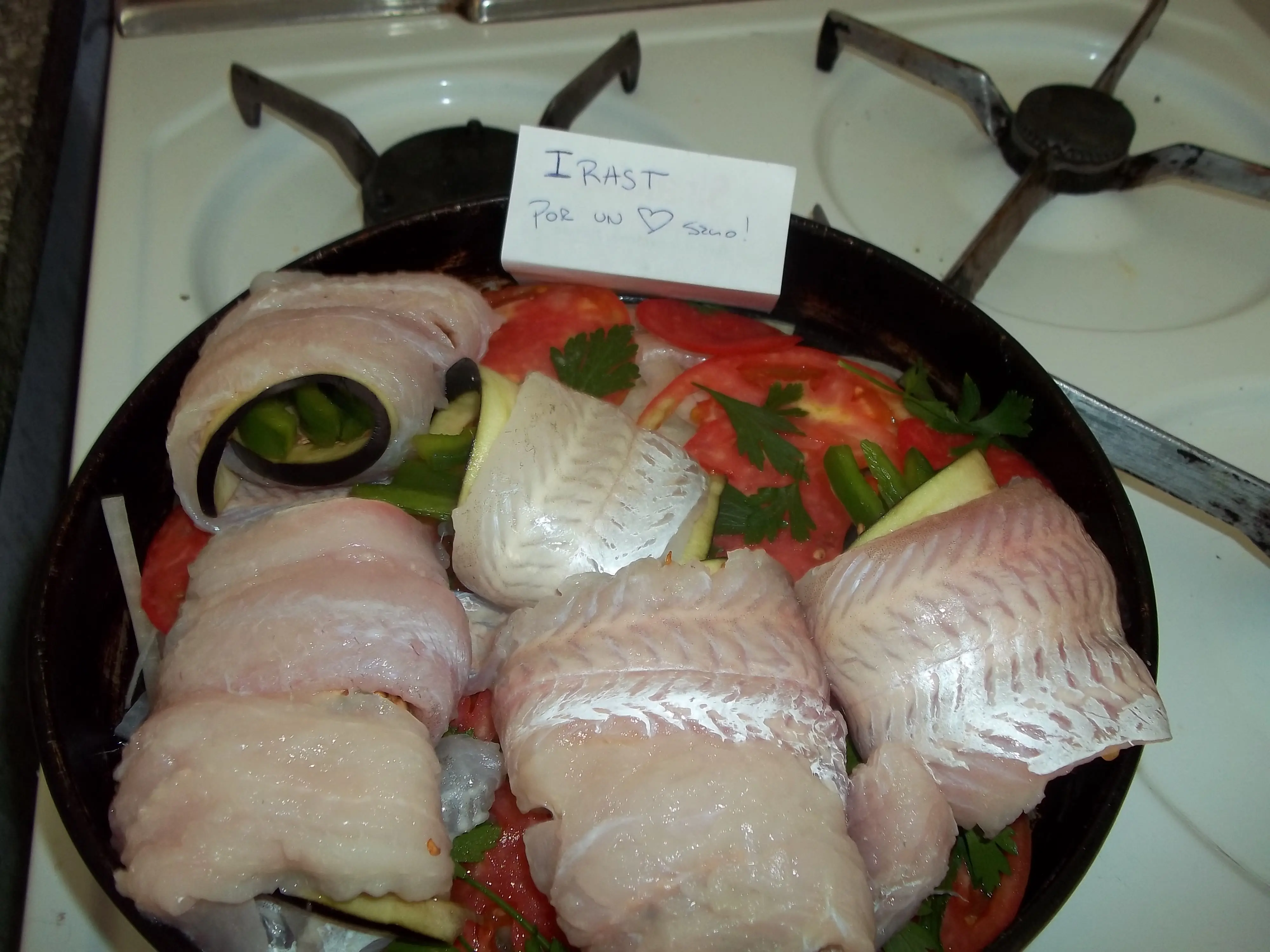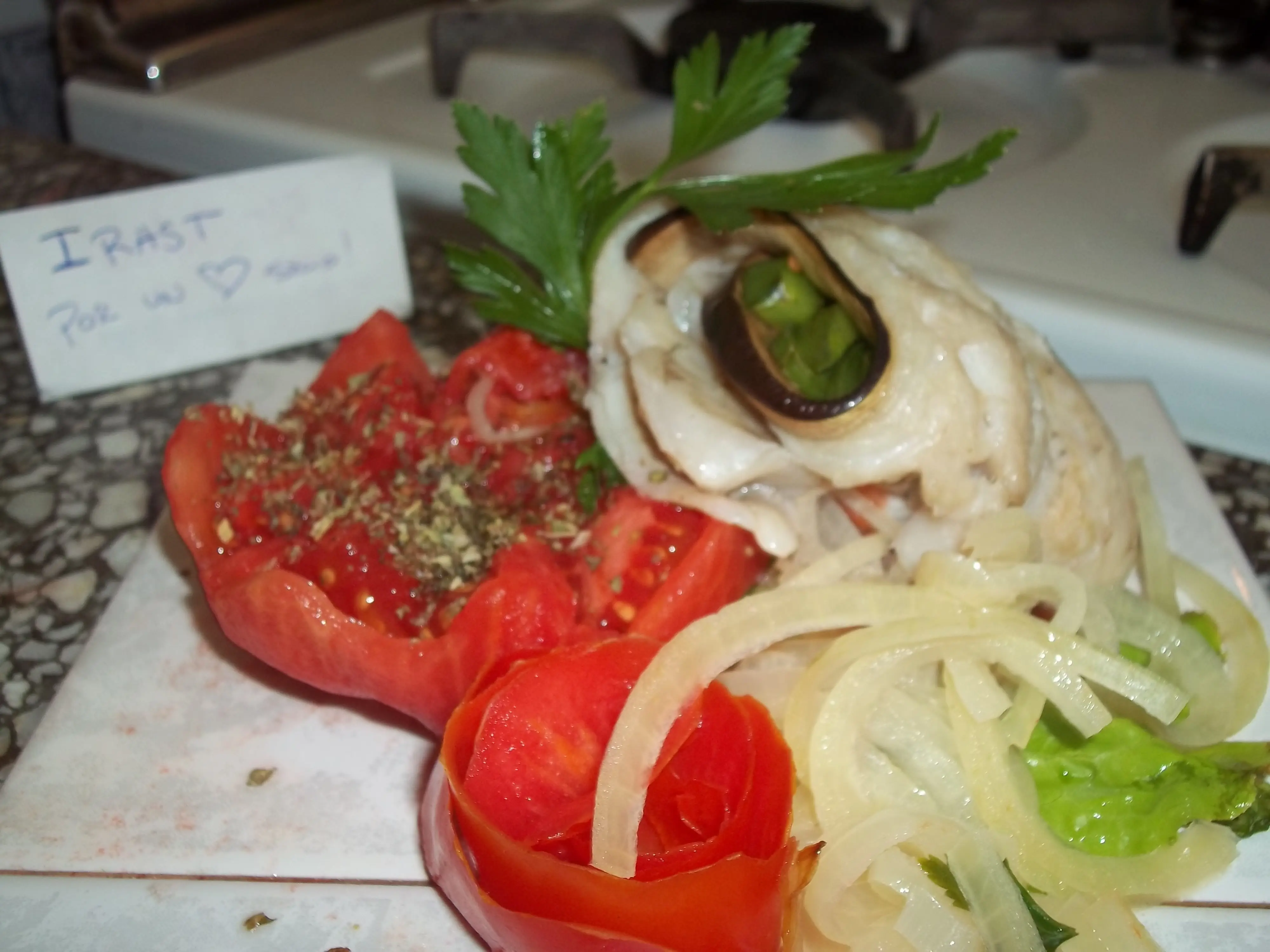 Luego disponemos sobre ellas las rodajas de tomate y un poco de perejil. Nótese que no agrego sal en este momento porque lo que quiero lograr es que esto sirva para saborizar el pescado con su aroma.