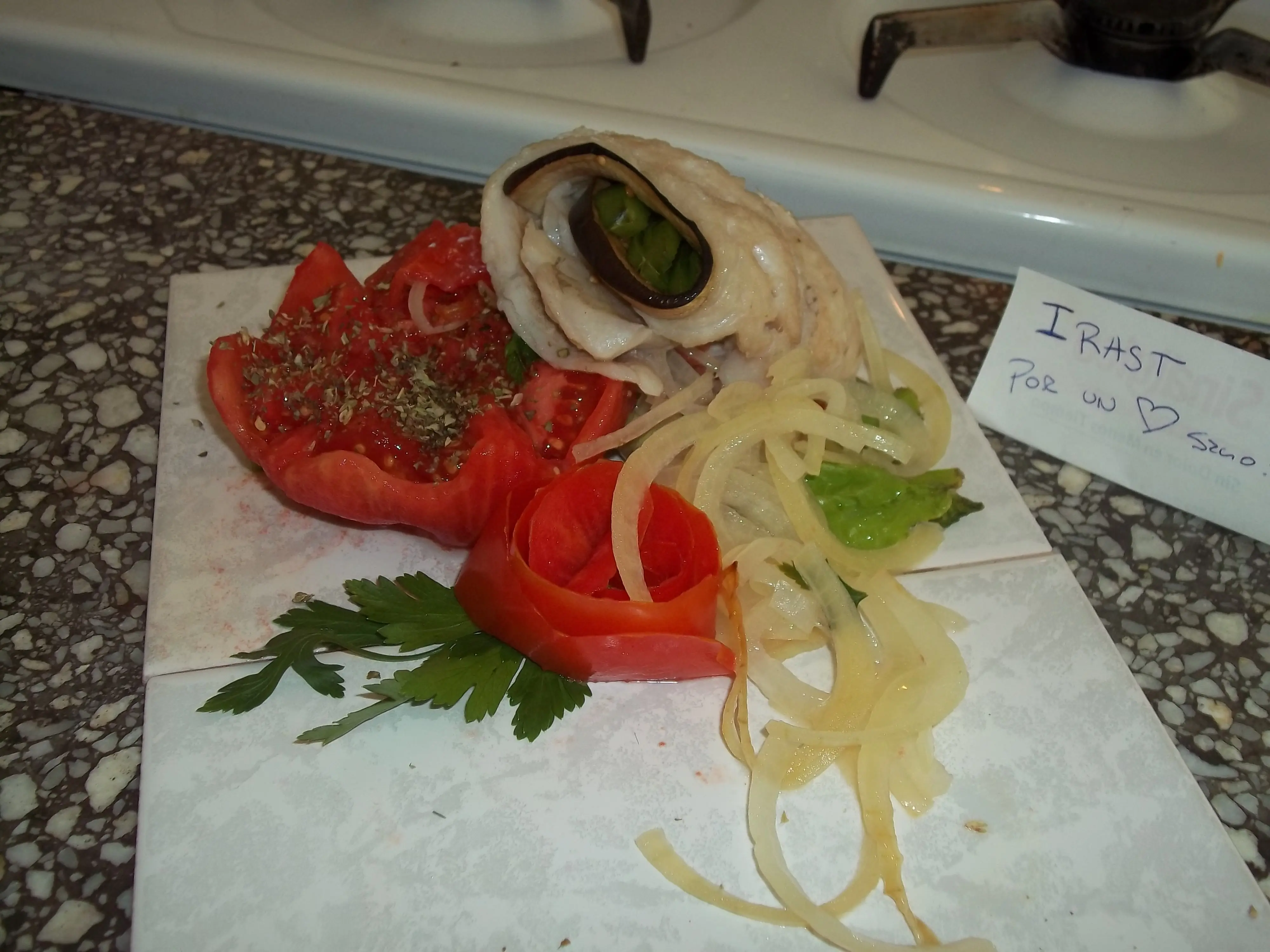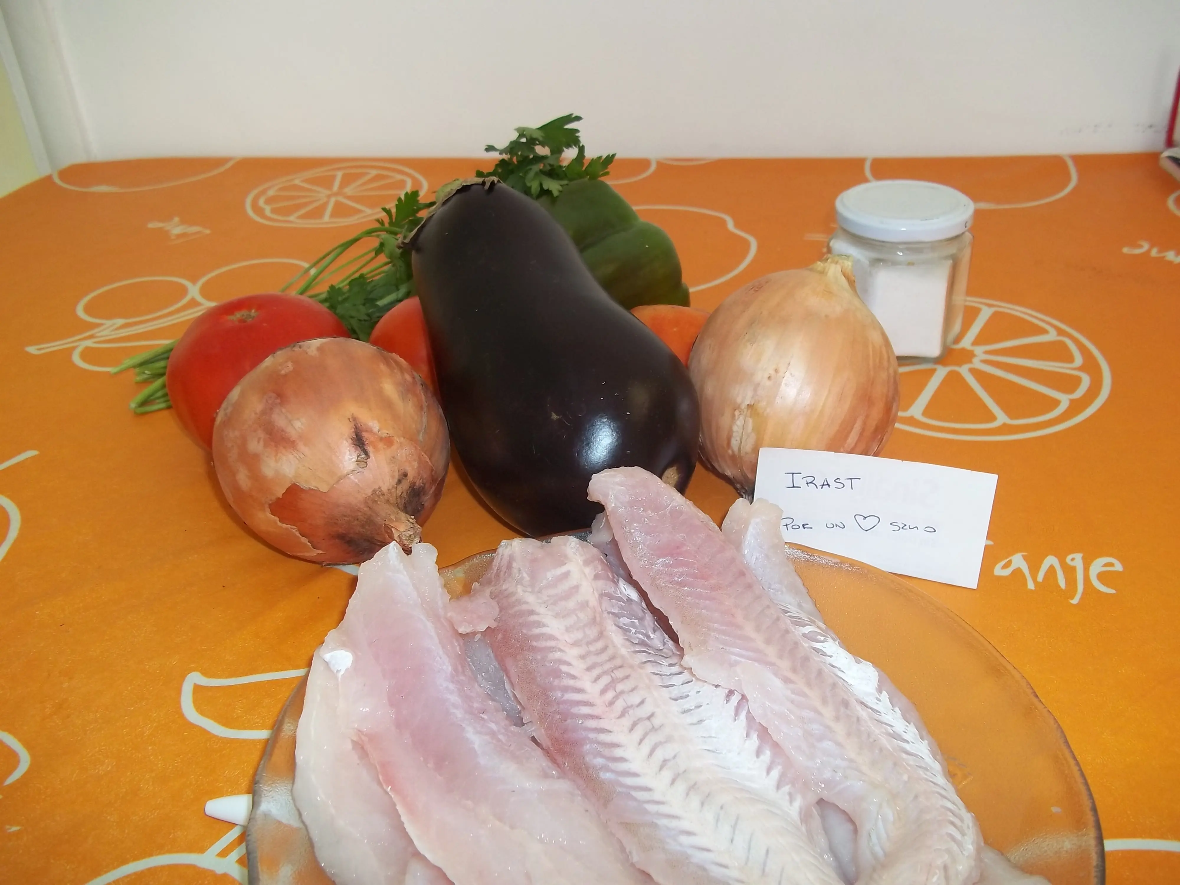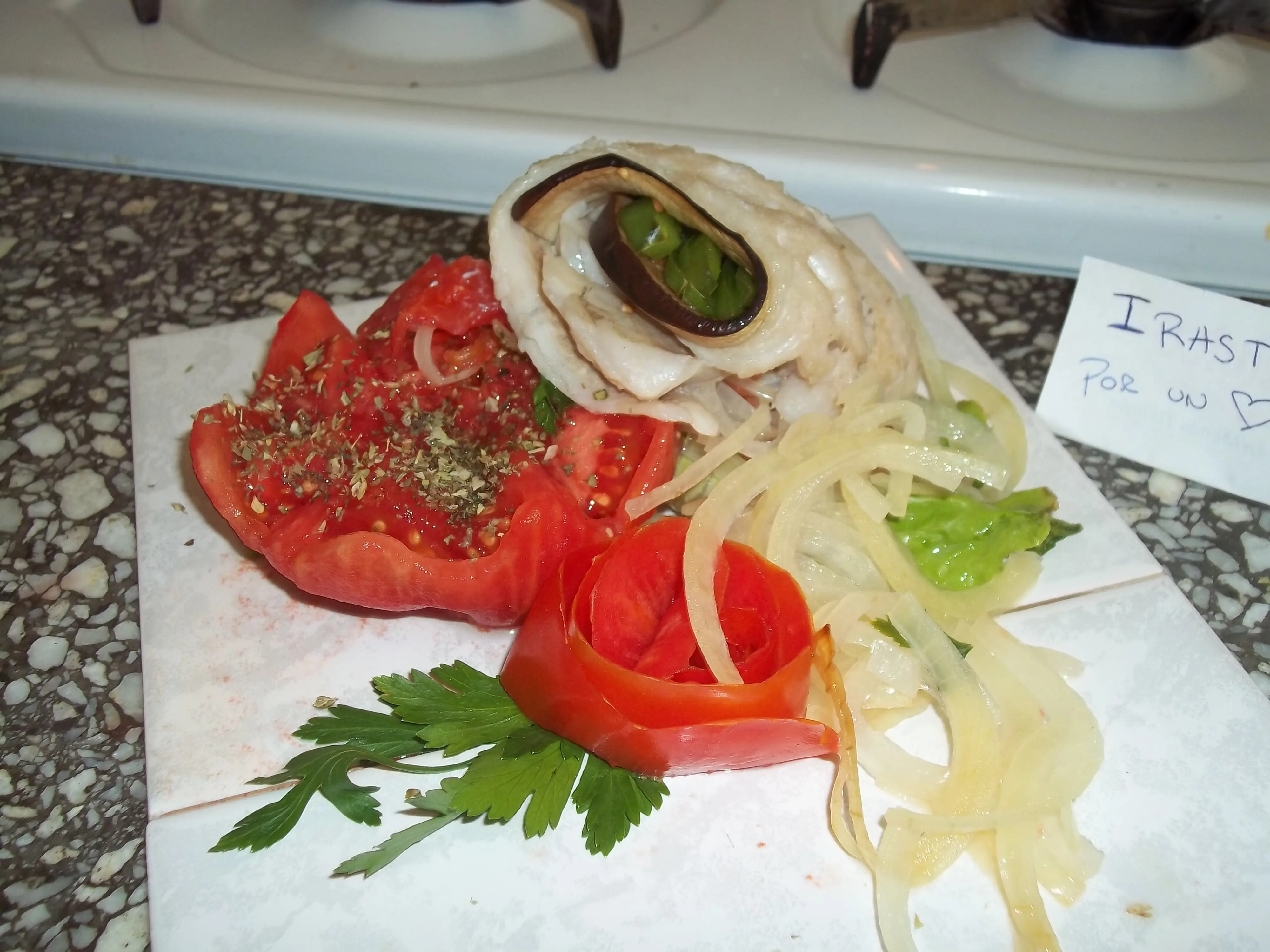Vamos a hacer unos roll de merluza, berenjena y morrones acompañados de tomate y orégano. .
