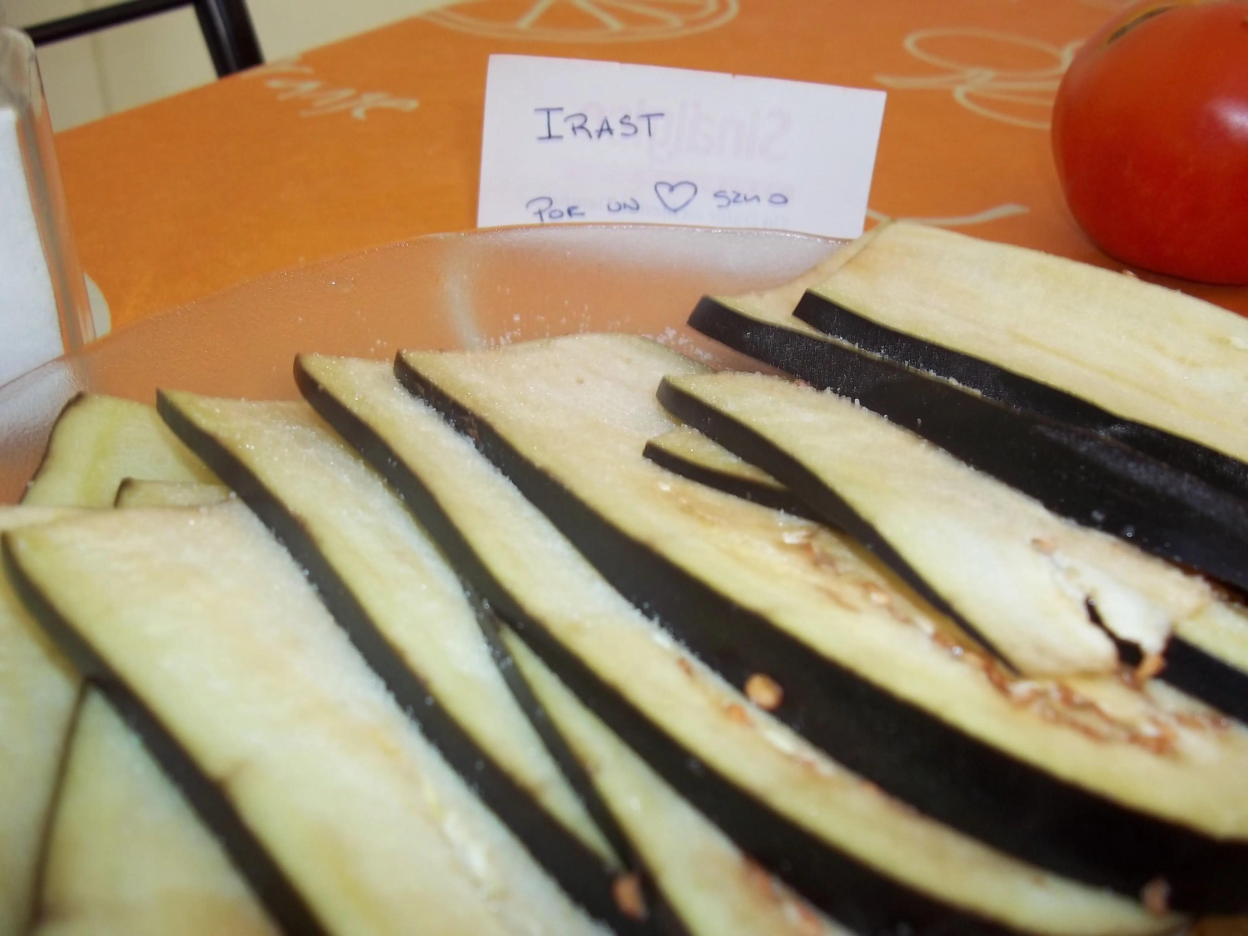 Cortamos la berenjena muy muy finita a lo largo, lo mas finita posible. Si queres te ayudas con una mandolina, yo lo hice a cuchillo porque la mandolina no estaba en casa. Es muy importante que sea MUY finito, porque esto va a ir luego al horno sin una cocción previa. De no poder cortarlo así vas a tener que cocinarlo en una grilla vuelta y vuelta antes con un poquito de rocío vegetal.