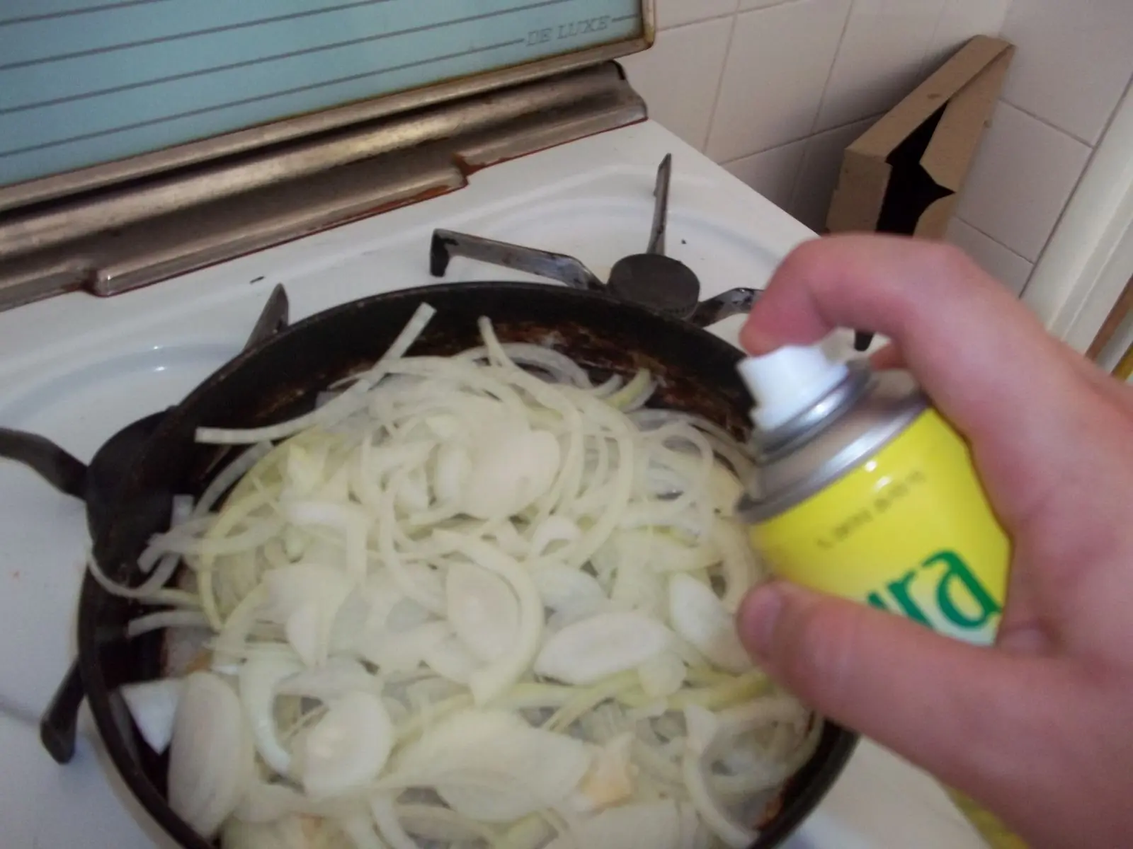 Disponemos las cebollas sobre la fuente que va a ir al horno y rociamos con rocío vegetal, así disminuimos la cantidad de materia grasa.