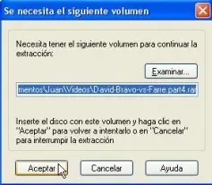 Tres partes de 1Mb y una de 0,36. Para recuperar el archivo original basta con descomprimir cualquiera de las partes. Esto sólo funcionará si tienes todas las partes en el mismo sitio de tu ordenador ya que al empezar a descomprimir la primera, WinRar buscará las partes restantes en el mismo lugar. Si no las encuentra te saldrá un mensaje como este: