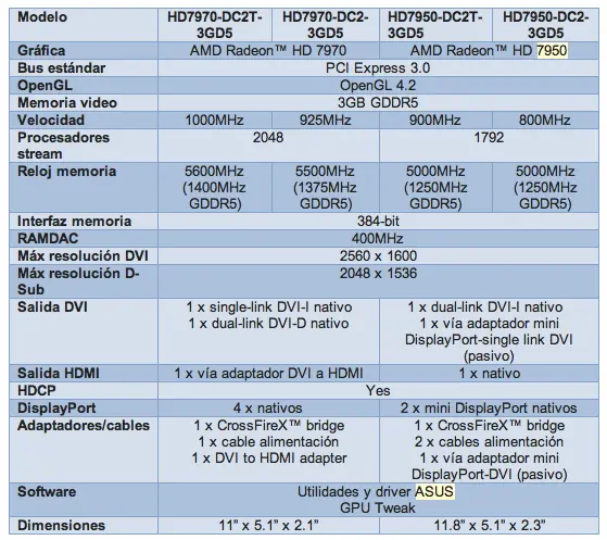 Esta semana han presentado las AMD 7950 y AMD 7970 en edición DirectCU II de Asus , y son fácilmente diferenciables respecto de otros modelos: ocupan tres slots, algo que nosotros ya vivimos con la GTX 580 Matrix. En el caso de estas dos tarjetas de AMD se distribuirán un total de cuatro modelos, las DirectCU II Top algo overclockeadas de fábrica y las estándar, con los valores por defecto indicados por AMD . A continuación os dejo con una tabla que recopila sus características y especificaciones técnicas: