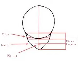 Comienza dibujando un gran circulo, ligeramente alargado, que será la frente.Ahora dibuja la parte inferior de la cara y la dividirás con suaves líneas de orientación (guías), como se muestra en la imagen. Debes tener en cuenta el espacio entre las secciones de la cara, todas tienen la misma distancia.
