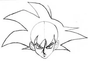 El siguiente paso es el cabello. Tienes que dibujar el contorno del pelo. Es muy grande y puntiagudo. Debes tener en cuenta que el pelo de Goku se inclina un poco hacia la derecha de su cabeza. Añade mas detalles a los ojos y oídos. Cuando llegues a la parte de las cejas, nota como estas descansan directamente en los ojos.Dibuja la nariz y la boca. Están muy juntos uno del otro, y la nariz tiene forma de “L”.