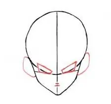 Ahora dibuja un par de líneas inclinadas para los ojos, marca la posición de la boca, que debe estar directamente debajo de la guía de la nariz.Asegúrate de que estas guías (líneas rojas en la imagen) están dibujadas suavemente ya que se van a borrar mas tarde.Bien, ahora borraremos algunas líneas innecesarias y dibujaremos el contorno de los ojos, que son dos bloques trapecios en ángulo. Nota que la línea inferior de los ojos tiene que coincidir con la guía inclinada que dibujaste anteriormente. También tenemos que dibujar los oídos como en la imagen.