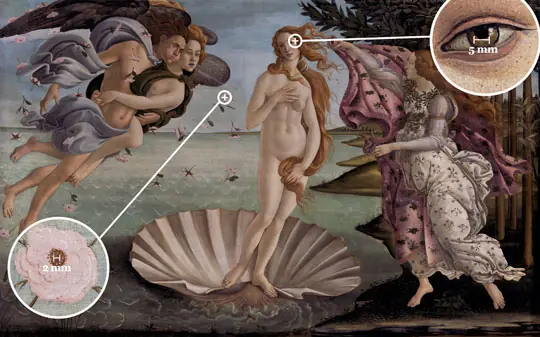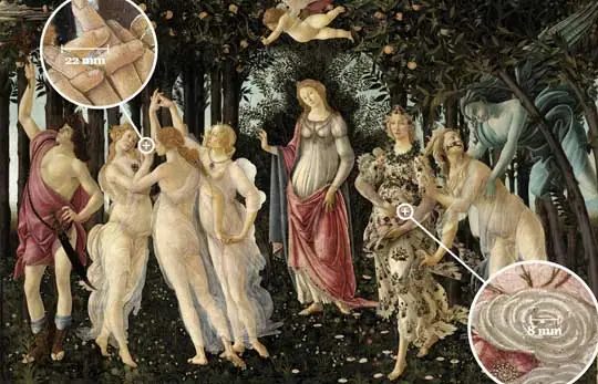Por ejemplo, para representar la refinada técnica pictórica de la "Primavera", de Boticelli, han hecho falta 28.000 millones de píxeles -unas 3.000 veces más que en la resolución de una fotografía realizada con una cámara digital normal-, con los que el internauta puede pasearse por cada pincelada.